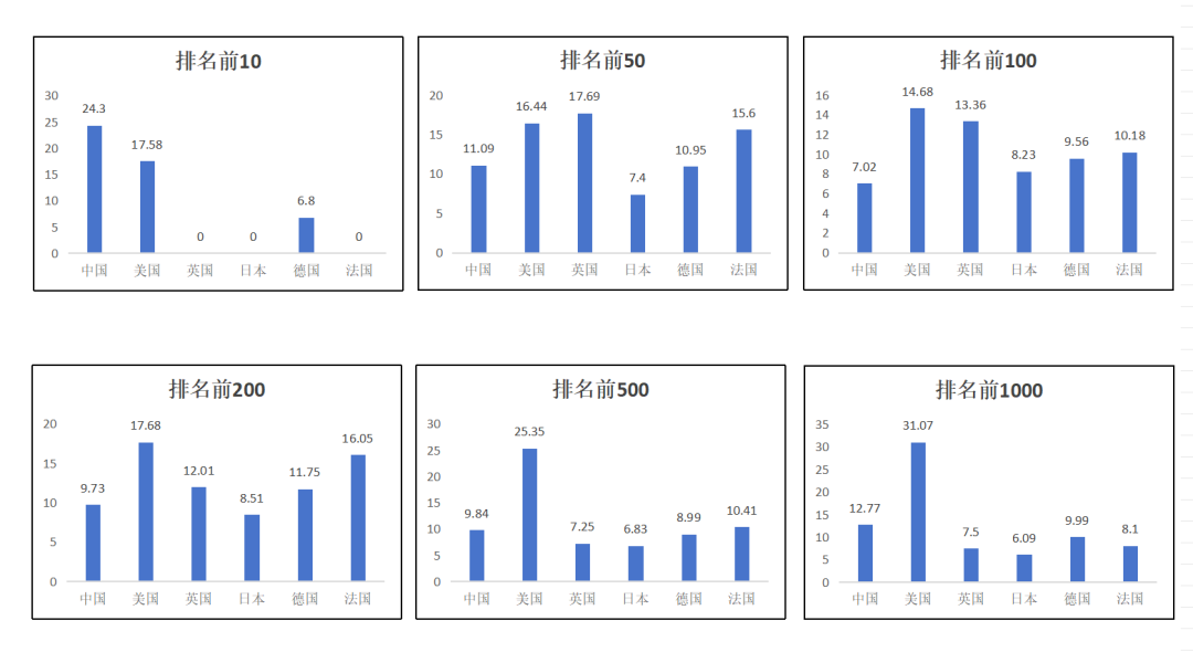 在平均研發投入強度上,其統計結果沒有隨著分段的逐漸擴大而表現出特別明確的變化趨勢。在排名前10的分段中,憑借著華為這一家科技領軍企業,中國的的平均研發投入強度位列六國之首。而在往后逐漸擴大的分段中,中國科技領軍企業的平均研發投入強度與其他國家相比沒有了優勢:其在排名前50、前100、前200與前500的分段中均處于中等偏下的水平;其在排名前1000的分段中僅次于美國,但與其他國家相比并沒有顯著優勢,且與美國的差距較大。