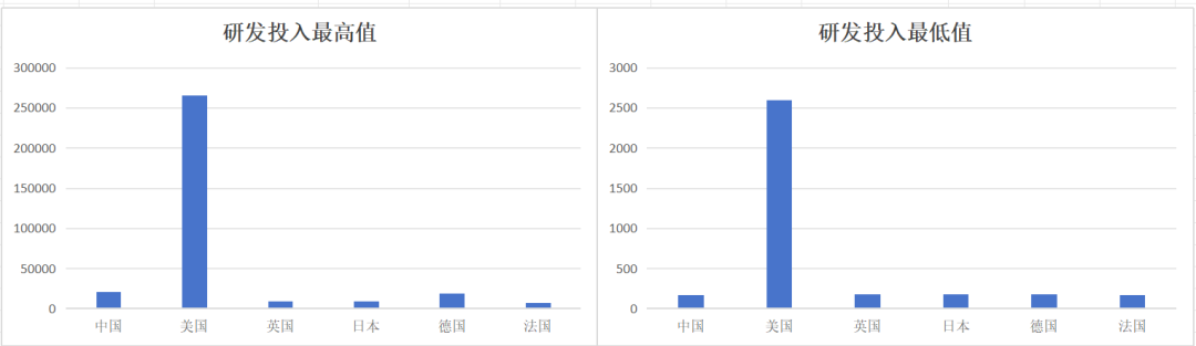 在研發投入最高值與最低值的比較上,中國科技領軍企業基本與主要國家持平,但與美國相比有差距十分明顯。