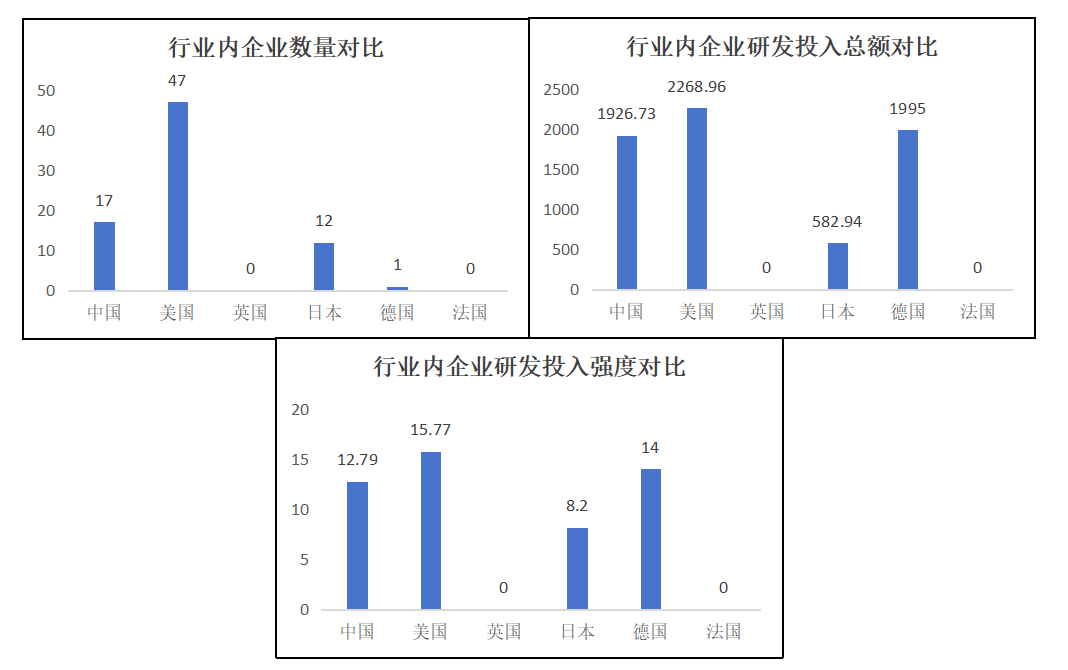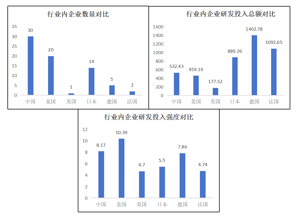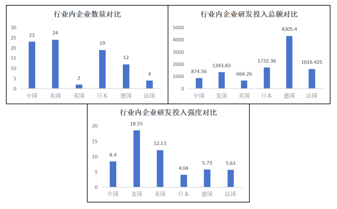 四是汽車和零部件行業上,中國科技領軍企業的數量優勢并不明顯;其平均研發投入總額僅略高于英國,處于較低的水平;其平均研發投入強度則大約處于中等偏上的水平??傊?,中國科技領軍企業在汽車和零部件行業上的發展比較一般,體量優勢不明顯,創新水平不高;在平均研發投入總額較低的情況下卻有著較高的平均研發投入強度,更是說明了我國汽車和零部件行業的營收情況不容樂觀。