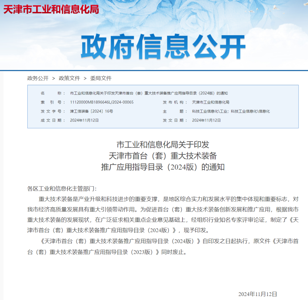 《天津市首臺(套)重大技術裝備推廣應用指導目錄(2024版)》