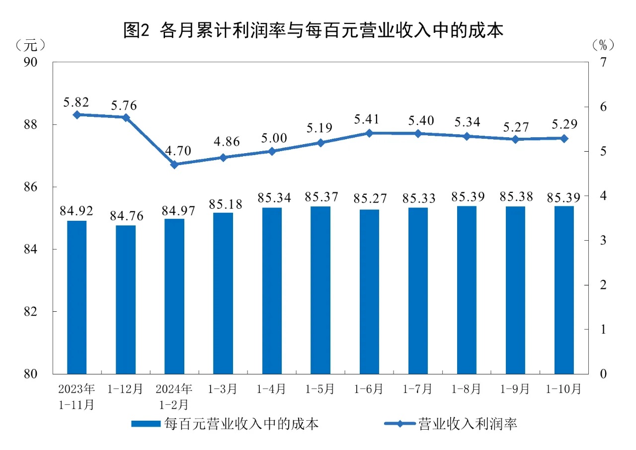 1—10月份,規模以上工業企業實現營業收入110.96萬億元,同比增長1.9%;發生營業成本94.75萬億元,增長2.3%;營業收入利潤率為5.29%,同比下降0.34個百分點。