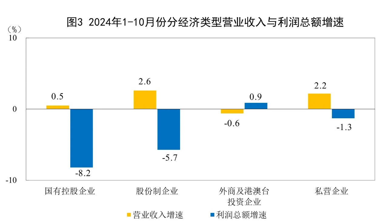 1—10月份,規模以上工業企業中,國有控股企業實現利潤總額18530.9億元,同比下降8.2%;股份制企業實現利潤總額43718.5億元,下降5.7%;外商及港澳臺投資企業實現利潤總額14559.0億元,增長0.9%;私營企業實現利潤總額16501.7億元,下降1.3%