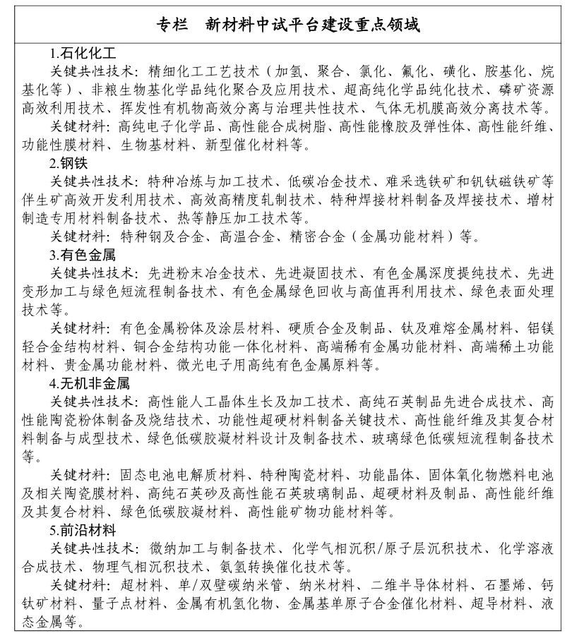 文件也進(jìn)一步明確了新材料中試平臺建設(shè)重點(diǎn)領(lǐng)域,詳情如下所示: