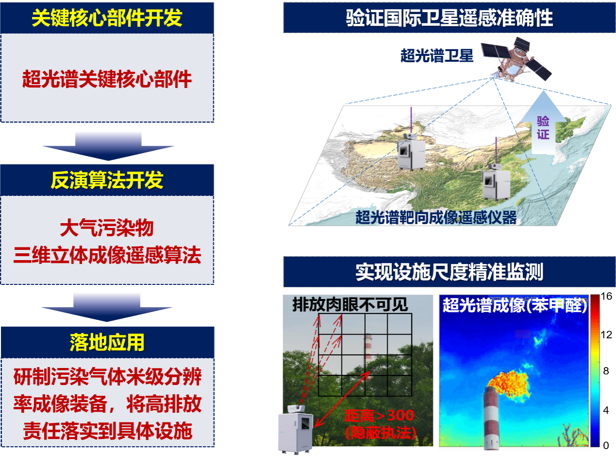 為此,團隊在國家重點研發計劃、國家自然科學基金重大研究計劃等項目支持下,研制了一款超光譜分辨率、高信噪比、狹縫函數穩定的超分辨光譜儀,打破了大氣環境遙感領域對歐美關鍵核心部件的長期高度依賴;研制了高光程體積比的多通道光學極弱吸收性氣體吸收截面檢測裝置,實現了對醛類、酮類、酯類和苯系物等吸收信號極弱的多種VOCs特征指紋吸收信號的精確探測;研發了超光譜解析融合人工智能的靶向成像遙感算法,解決了羽流內極復雜光子路徑精準刻畫的難題,實現了排放羽流米級分辨率成像觀測,將污染排放責任從公里級網格細化到具體施級尺度。