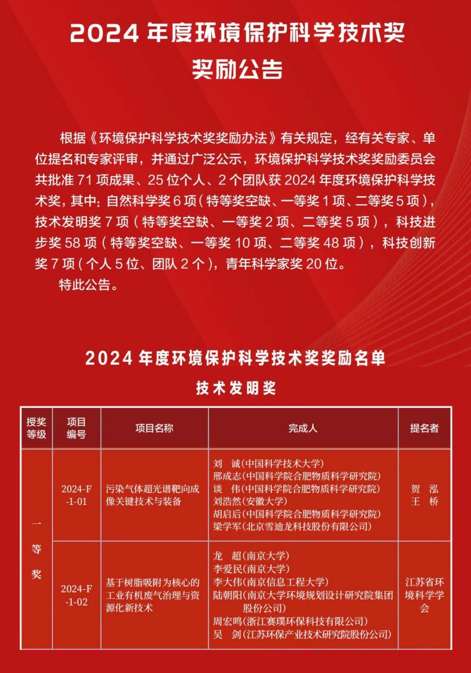 110日,生態環境部發布2024年度環境保護科學技術獎獎勵公告。中國科學技術大學、中國科學院合肥物質科學研究院、安徽大學、北京雪迪龍科技股份有限公司共同完成的科研成果污染氣體超光譜靶向成像關鍵技術與裝備,由賀泓、王橋兩位中國工程院院士提名,榮獲2024年度環境保護科學技術獎技術發明獎一等獎。