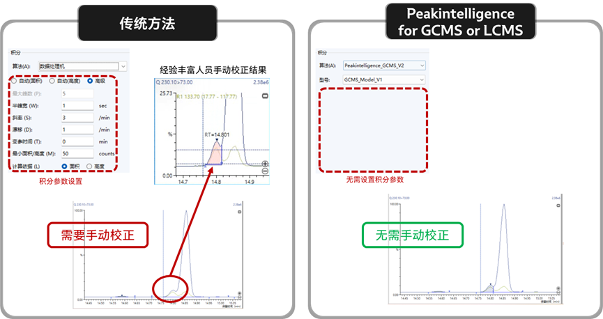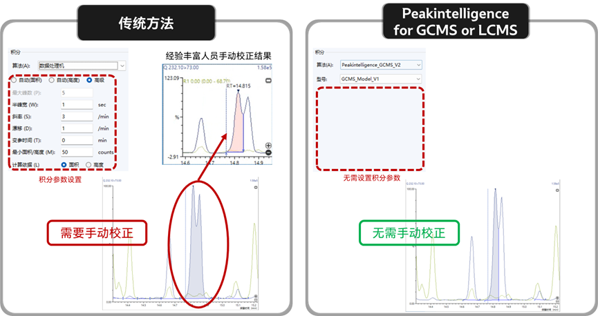 Peakintelligence亮點(diǎn)在于它只需選擇要使用的算法和模型,無需再設(shè)置任何積分參數(shù),即使是色譜峰基線分配困難、重疊峰、痕量小峰等復(fù)雜情況,亦可實(shí)現(xiàn)高水平的自動(dòng)積分結(jié)果,大大簡化積分參數(shù)優(yōu)化及手動(dòng)校正工作。