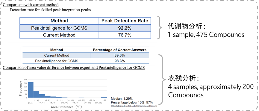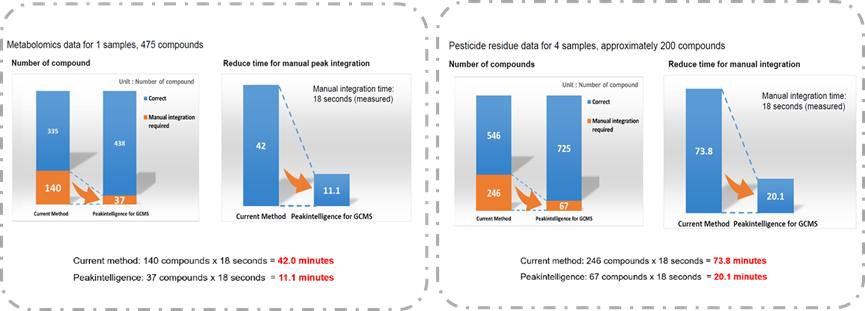 為進(jìn)一步驗(yàn)證積分結(jié)果的準(zhǔn)確性,分別選取1個(gè)含有475種代謝物樣品和4個(gè)含有約200種農(nóng)藥殘留組分樣品的數(shù)據(jù)進(jìn)行傳統(tǒng)方法和智能積分方法的分析比對(duì),結(jié)果確證Peakintelligence可以重現(xiàn)90%以上專家積分結(jié)果。與此同時(shí),經(jīng)驗(yàn)豐富的操作員分別對(duì)兩組積分結(jié)果進(jìn)行目視審查和手動(dòng)積分修正,統(tǒng)計(jì)并比較數(shù)據(jù)處理的操作用時(shí),結(jié)果顯示代謝物和農(nóng)殘兩類樣品定量分析時(shí)間均縮短至傳統(tǒng)方法的1/4,數(shù)據(jù)處理效率顯著提升。