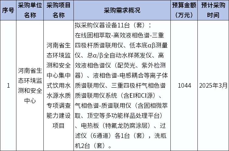 河南省生態環境監測和安全中心集中式飲用水水源水質專項調查能力建設項目采購意向公開,擬采購儀器設備11臺(套),預算金額1044萬元。