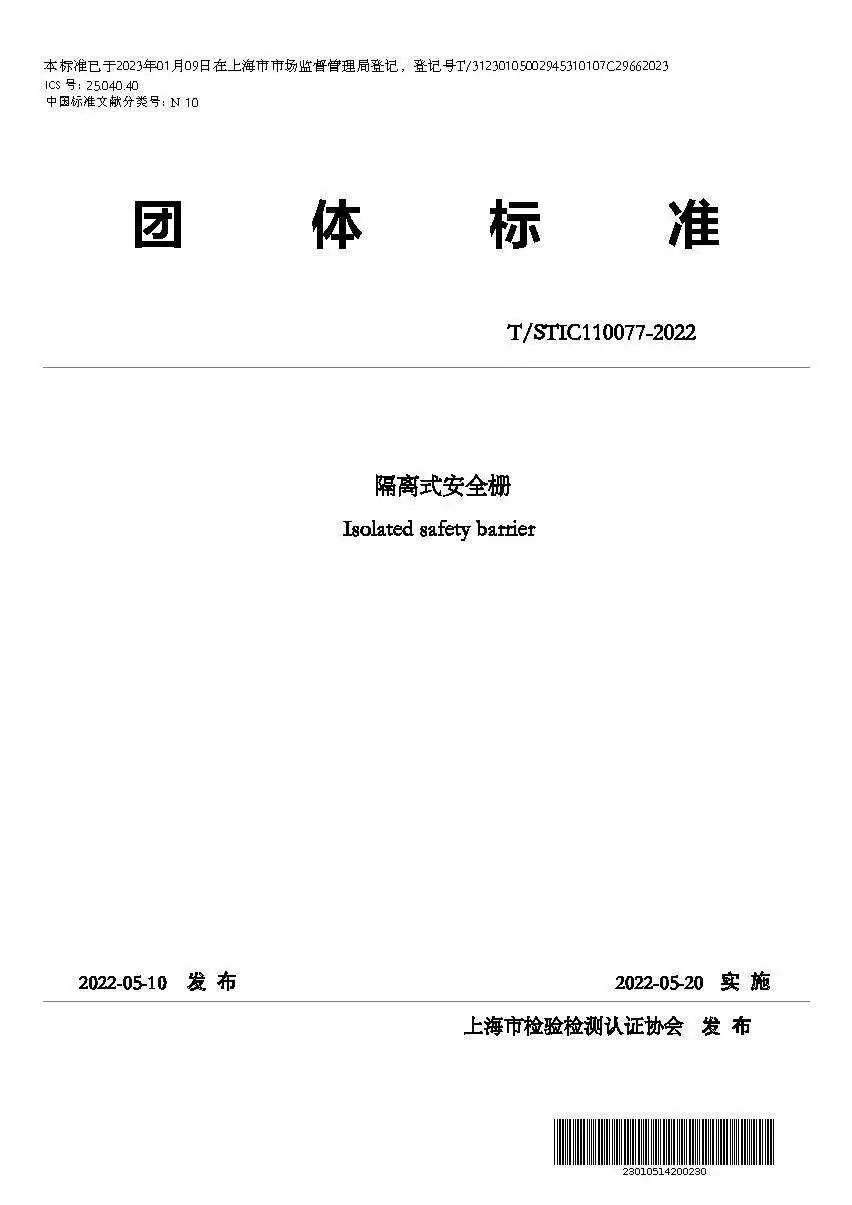 T/STIC 110077—2022《隔離式安全柵》標準規定了隔離式安全柵的分類、技術要求、試驗方法、 檢驗規則與合格判定,以及標志、包裝及貯存,適用于包括模擬信號、溫度信號和數字信號任何具有特定的輸入、輸出變量,且輸入輸出變量之間具有特定關系(傳遞函數)的信號隔離和限能功能的隔離式安全柵。