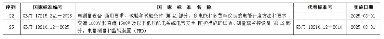 兩項(xiàng)標(biāo)準(zhǔn)分別為:GB/T 17215.241—2025《電測(cè)量設(shè)備 通用要求、試驗(yàn)和試驗(yàn)條件 第41部分:多電能和多費(fèi)率儀表的電能計(jì)度方法和要求》、GB/T 18216.12—2025《交流1000V和直流1500V及以下低壓配電系統(tǒng)電氣安全 防護(hù)措施的試驗(yàn)、測(cè)量或監(jiān)控設(shè)備 第12部分:電量測(cè)量和監(jiān)視裝置(PMD)》。