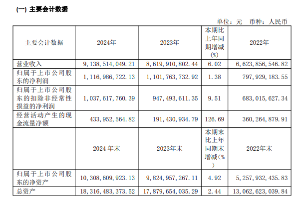 該公司營業(yè)收入達91.39億元,同比增長6.02%;歸母凈利潤為11.17億元,同比增長1.38%;扣非歸母凈利潤10.38億元,同比增長9.51%。
