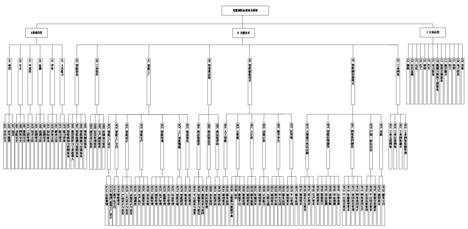 智能制造標準體系框架圖包含了智能制造標準體系的基本組成單元,具體包括A基礎共性、B關鍵技術、C行業應用等3個部分,如圖3所示。