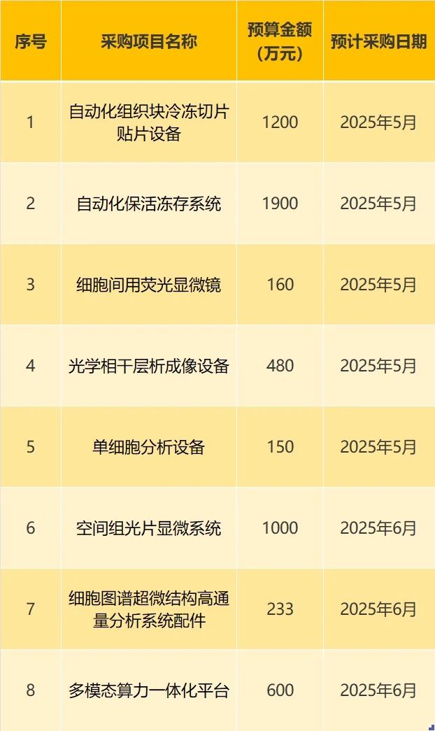 此次的采購計劃包括自動化組織塊冷凍切片貼片設備、自動化保活凍存系統、光學相干層析成像設備、單細胞分析設備等。這些設備主要用于組織樣品的冷凍切片、保活凍存、細胞觀察與分析、三維結構成像、單細胞轉錄組學數據獲取以及細胞超微結構研究等方面。