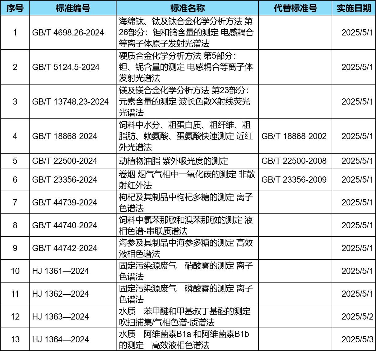 2025年5月1日,一批涉及色譜、質(zhì)譜、光譜等分析測試方法的國家標準正式實施。這些標準廣泛應(yīng)用于食品、化工、地質(zhì)、環(huán)境等個領(lǐng)域,旨在進一步規(guī)范分析測試技術(shù),提升行業(yè)檢測能力和科學性。