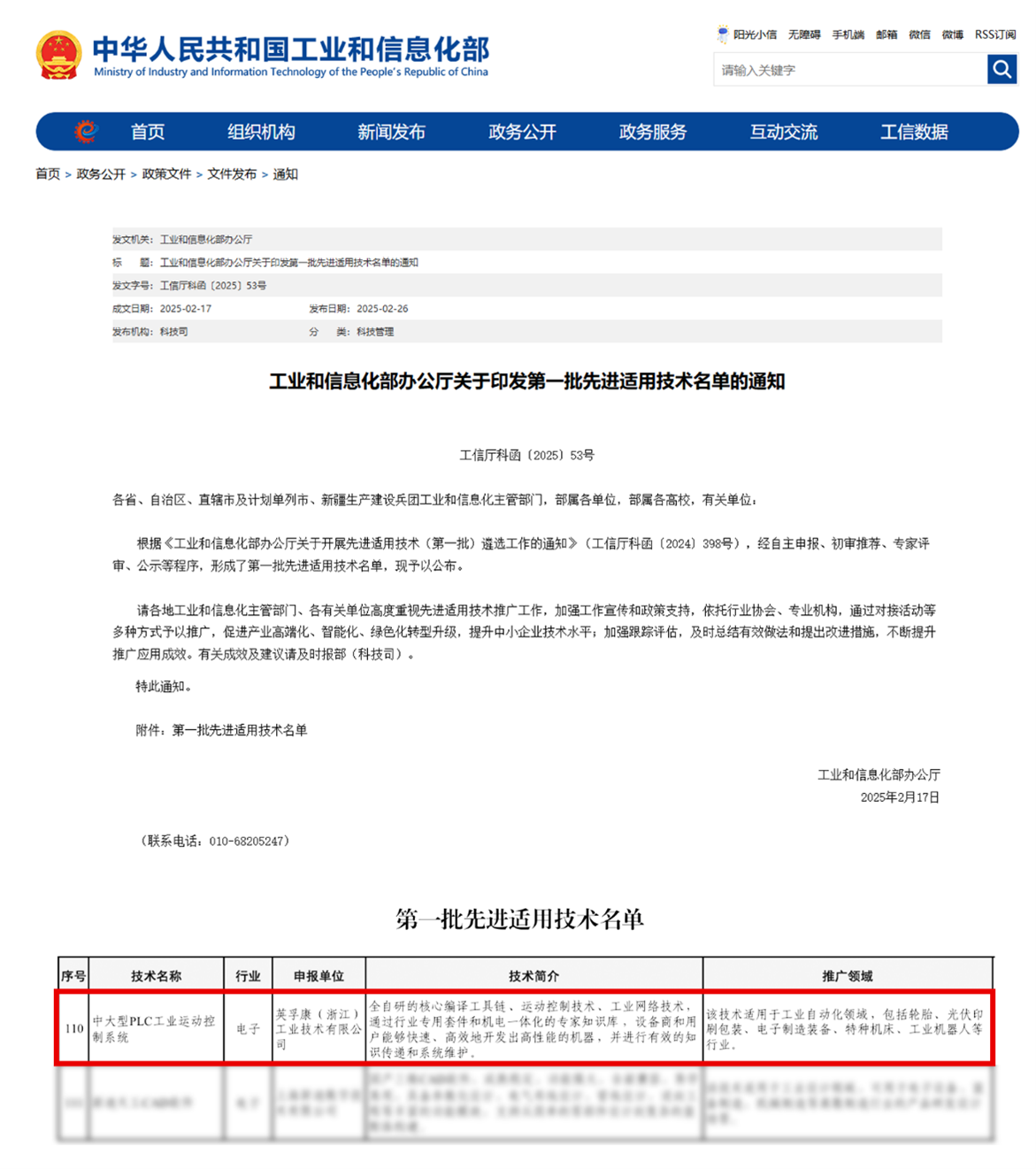 值得驕傲的是,在2025年2月,英孚康自主研發(fā)的“大中型PLC工業(yè)運動控制系統(tǒng)”憑借技術領先性、產(chǎn)業(yè)適配性與生態(tài)創(chuàng)新性入選了工信部第一批先進適用技術名單。作為國家層面的權威評選,工信部對參評技術從技術的創(chuàng)新性、成熟度、應用前景到市場競爭力、經(jīng)濟效益等多個維度進行穿透式評估,能夠入選是對企業(yè)技術實力和創(chuàng)新能力的最高褒獎,其權威性與含金量不言而喻,這一殊榮無疑是對英孚康的技術實力和發(fā)展前景的高度認可。