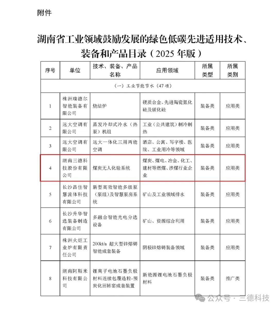 近日,湖南省工業和信息化廳發布《湖南省工業領域鼓勵發展的綠色低碳先進適用技術、裝備和產品目錄(2025年版)》,三德科技(股票代碼:300515)自主研發的煤炭無人化驗系統(SDIAS)成功入選,標志著該裝備在智能化檢測與綠色低碳領域的創新價值獲得政府高度認可。