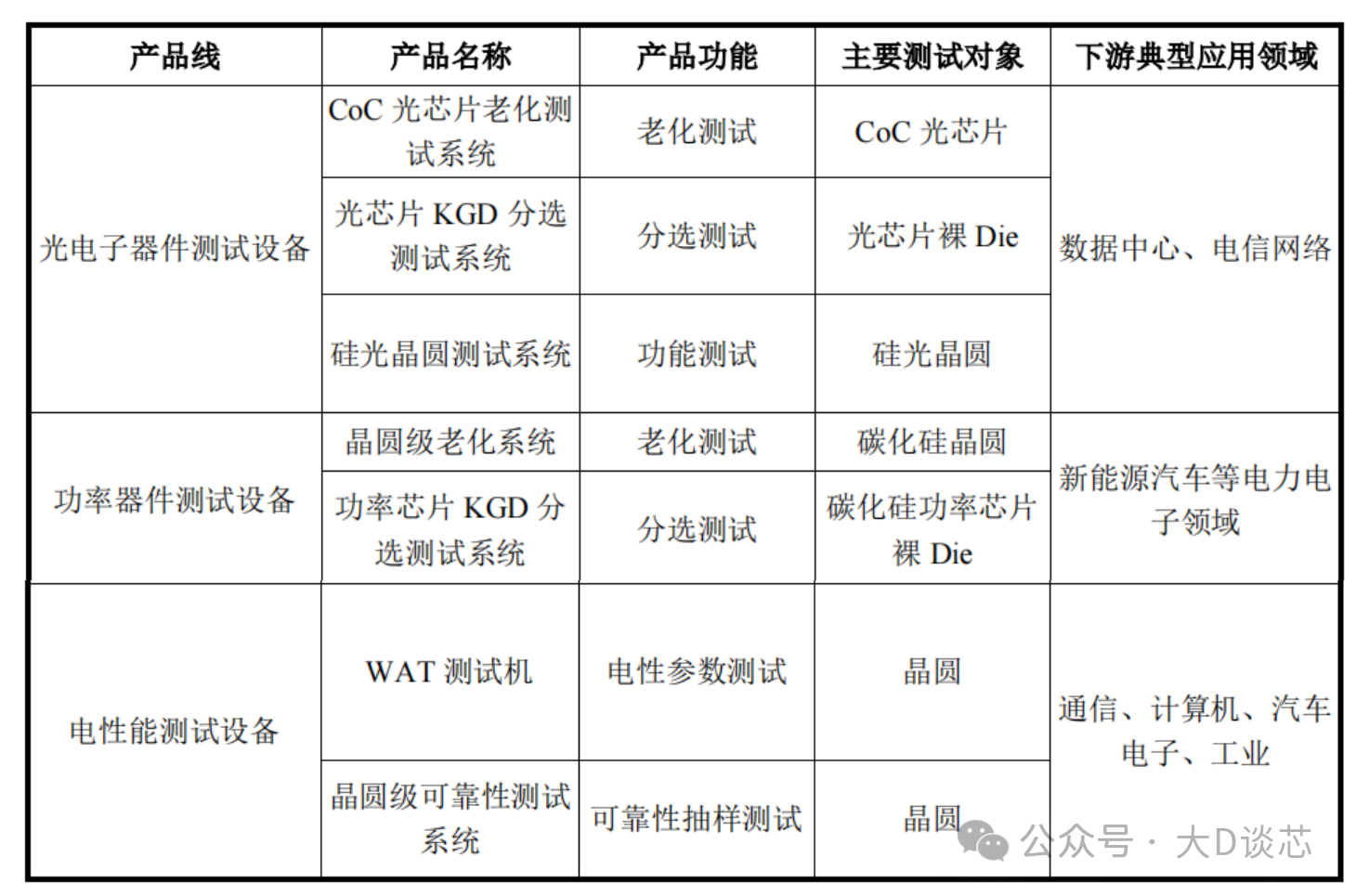 公司半導(dǎo)體測(cè)試設(shè)備包括主要面向光通信測(cè)試的光電子器件測(cè)試設(shè)備(CoC光芯片老化測(cè)試系統(tǒng)、光芯片KGD分選測(cè)試系統(tǒng)、硅光晶圓測(cè)試系統(tǒng)等),主要面向功率器件測(cè)試的功率器件測(cè)試設(shè)備(晶圓級(jí)老化系統(tǒng)、功率芯片KGD分選測(cè)試系統(tǒng)等),以及主要面向半導(dǎo)體集成電路測(cè)試的電性能測(cè)試設(shè)備(WAT測(cè)試機(jī)和晶圓級(jí)可靠性測(cè)試系統(tǒng))。