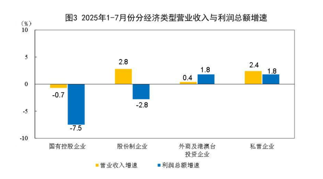 1—7月份,規(guī)模以上工業(yè)企業(yè)中,國有控股企業(yè)實現(xiàn)利潤總額12823.4億元,同比下降7.5%;股份制企業(yè)實現(xiàn)利潤總額29742.5億元,下降2.8%;外商及港澳臺投資企業(yè)實現(xiàn)利潤總額10216.7億元,增長1.8%;私營企業(yè)實現(xiàn)利潤總額11183.7億元,增長1.8%。1—7月份,采礦業(yè)實現(xiàn)利潤總額4930.9億元,同比下降31.6%;制造業(yè)實現(xiàn)利潤總額30235.8億元,增長4.8%;電力、熱力、燃氣及水生產(chǎn)和供應(yīng)業(yè)實現(xiàn)利潤總額5036.8億元,增長3.9%。