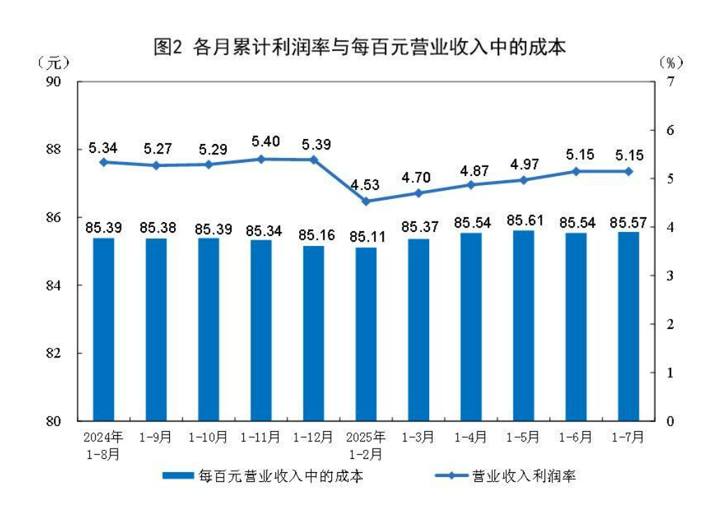 1—7月份,規(guī)模以上工業(yè)企業(yè)實現(xiàn)營業(yè)收入78.07萬億元,同比增長2.3%;發(fā)生營業(yè)成本66.80萬億元,增長2.5%;營業(yè)收入利潤率為5.15%,同比下降0.21個百分點。