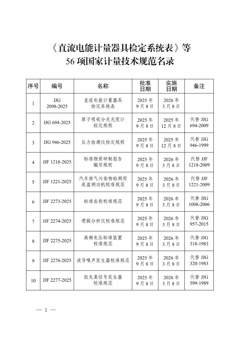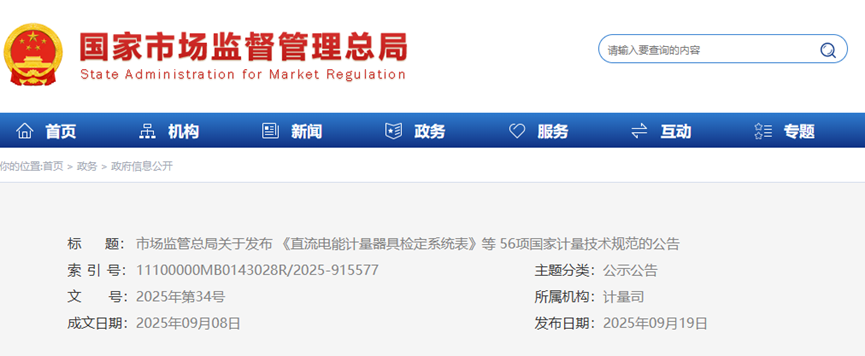 市場監(jiān)管總局關(guān)于發(fā)布《直流電能計量器具檢定系統(tǒng)表》等56項國家計量技術(shù)規(guī)范的公告