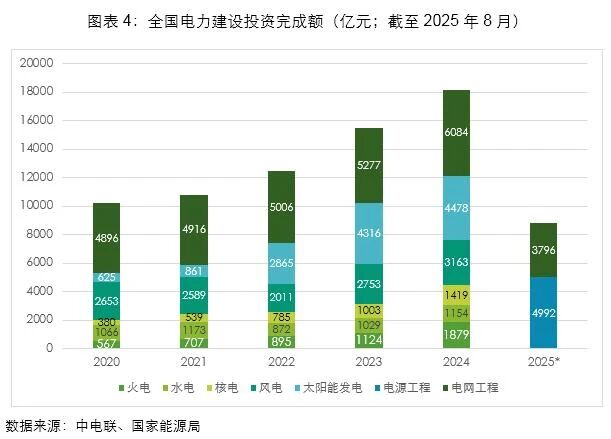 “十四五”我國(guó)電力建設(shè)投資保持快速增長(zhǎng),2020年突破1萬(wàn)億元,2024年超1.8萬(wàn)億元,20251-8月電源及電網(wǎng)投資同比均進(jìn)一步增長(zhǎng)。其中,火電投資增長(zhǎng)速度同樣迅猛,從2020年的567億元,到2023年的1124億元已接近翻倍,再到2024年的1879億元又有67%的大幅增長(zhǎng)。