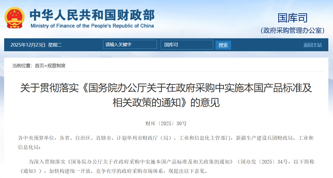《通知》以習近平新時代中國特色社會主義思想為指導,全面貫徹黨的二十大和二十屆歷次全會精神,緊扣高質量發(fā)展要求,結合我國發(fā)展實際,對接國際高標準經(jīng)貿(mào)規(guī)則,系統(tǒng)提出了構建政府采購中本國產(chǎn)品標準體系以及對本國產(chǎn)品予以支持的工作要求,為進一步保障各類經(jīng)營主體平等參與政府采購活動提供了制度依據(jù)。