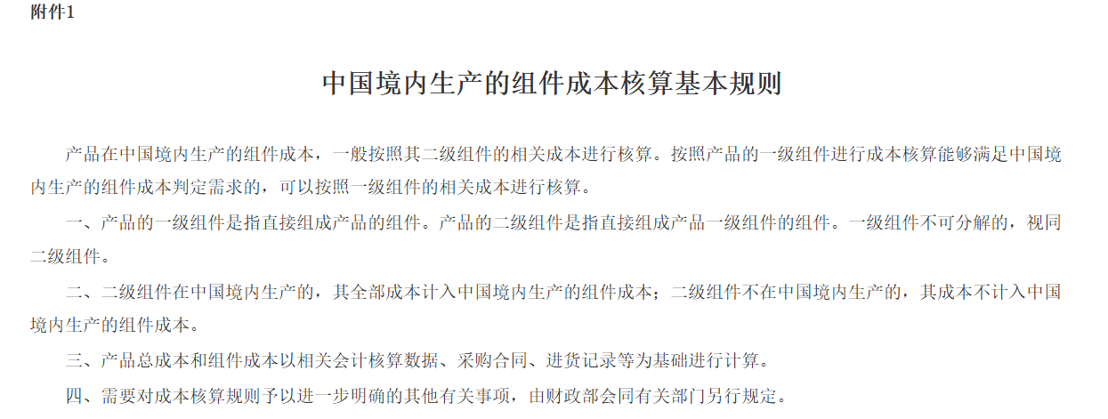 分類制定具體標準:財政部將會同工業(yè)和信息化部等有關行業(yè)主管部門,分產(chǎn)品制定中國境內(nèi)生產(chǎn)的組件成本占比要求,以及特定產(chǎn)品的關鍵組件、關鍵工序相關要求,明確成本核算規(guī)則,并合理設置過渡期。