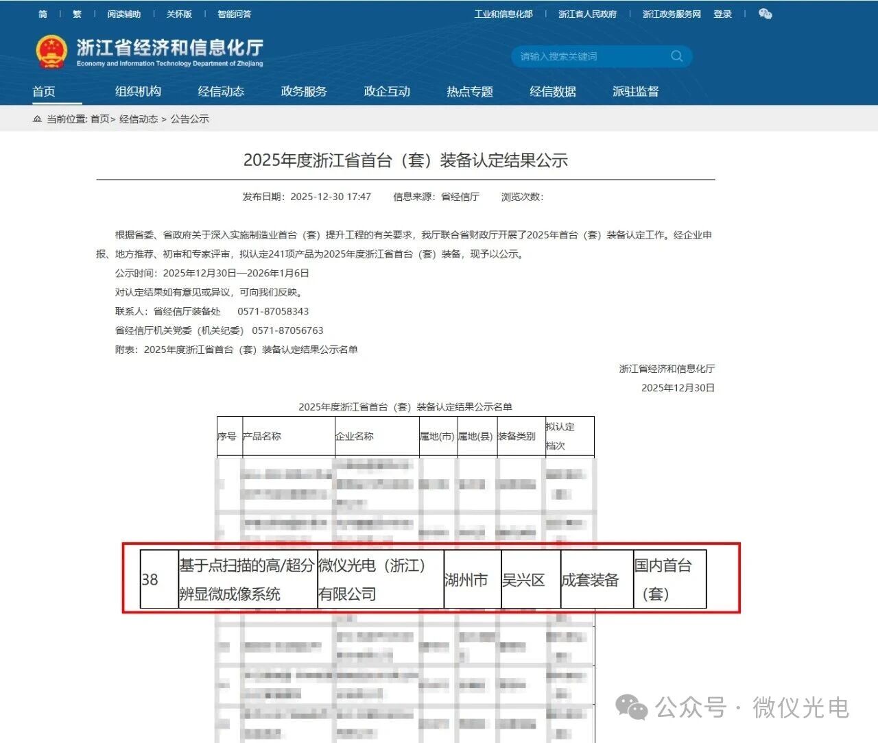 近日,浙江省經濟和信息化廳公布了2025年度浙江省“首臺(套)”裝備認定結果,微儀光電(浙江)有限公司(以下簡稱“微儀光電”)的“基于點掃描的高/超分辨顯微成像系統”榮耀上榜,榮獲“國內首臺(套)”認定。這一認定不僅是對微儀光電技術實力的高度認可,更標志著我國在超分辨STED顯微成像領域取得了階段性里程碑性突破,打破國外進口產品多年壟斷,解決了國產高端超分辨STED顯微鏡“卡脖子”難題。實現了核心技術與關鍵設備的自主可控,并達到量產水平。