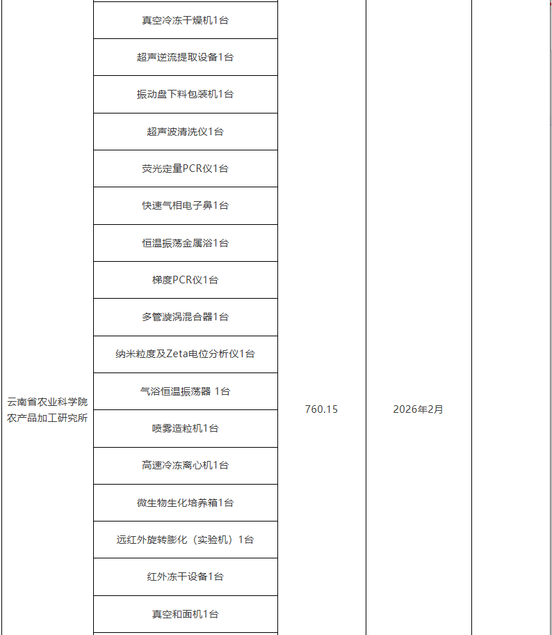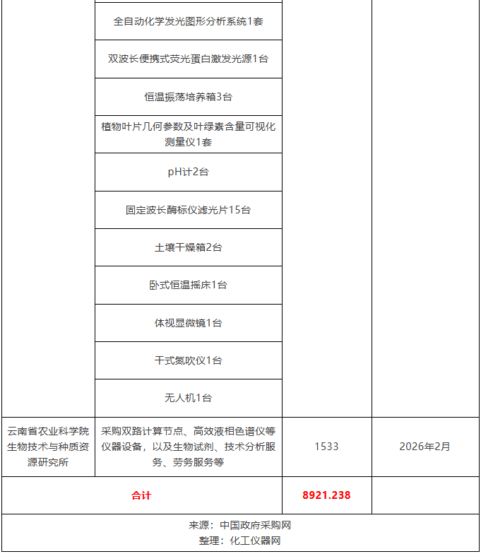 近期,云南省農(nóng)業(yè)科學(xué)院多家院屬單位發(fā)布2026年儀器設(shè)備采購(gòu)意向,計(jì)劃采購(gòu)全自動(dòng)智能固相萃取儀、自動(dòng)核酸提取儀、熒光顯微鏡、近紅外分析儀、組織細(xì)胞破碎儀、紫外分光光度計(jì)、高速冷凍離心機(jī)、真空冷凍干燥機(jī)等儀器設(shè)備,預(yù)算總金額8921.238萬(wàn)元。預(yù)計(jì)采購(gòu)時(shí)間2026年2月~11月。